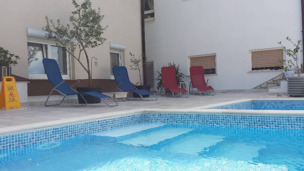 The apartments with SWIMMING POOL - Svob family in Novi Vinodolski - Adria - Kvarner - croatia - EU is in a beautiful location right in the town of Novi Vinodolski, not far from the beautiful beach (good for childrens). New in our offer pool in the garden, for our guests. Our 2 houses with apartments are on very good position only 250 m to the center of town. The property has its own parking lot. On the few larges terraces there is a 3 barbecue available. From the balcony you have a beautiful view of the sea and the island of San Marino. In our garden with many plants and flowers meditteranen you can properly recover, enjoy reading a book while your children swim in the pool. Novi Vinodolski has a very clean beach, crystal clear water and clean air. The pleasant climate, you will spend a wonderful holiday. The city of Novi Vinodolski offers many rich events such as Carnival in the summer and has a wide gastronomic offer. From the hill you can enjoy a sweeping view of the entire region. From Novi Vinodolski you can take boat excursions or explore the region by bike. For us wine is grown, you can taste and buy directly from the local winemakers. You are welcome to join us in the Kvarner Bay. Spend with us a stress free and relaxing holiday. Refuel your body and soul with us again really on. Dear guests, you spend your holidays in our apartments: 1. House - with swimming pool 2 Apartments for 4+1 persons, 3 Apartments for 2+1 persons. In 2. House : 2 New Apartments for 4+1 persons.Our two houses are only 150 m. Dates available in Apartments from 23.08. , 26.08.
