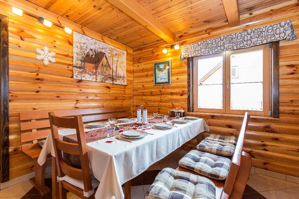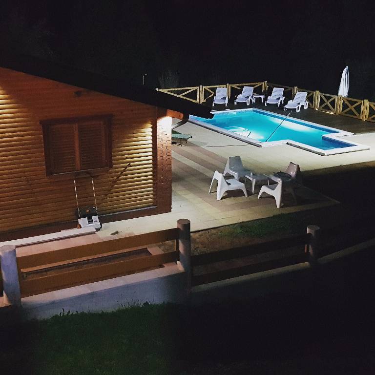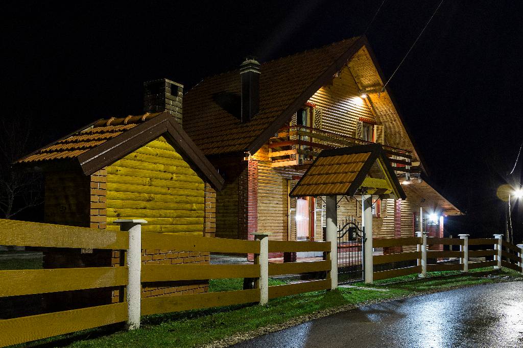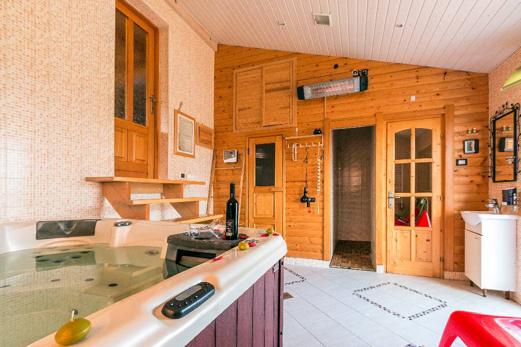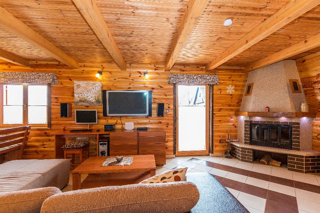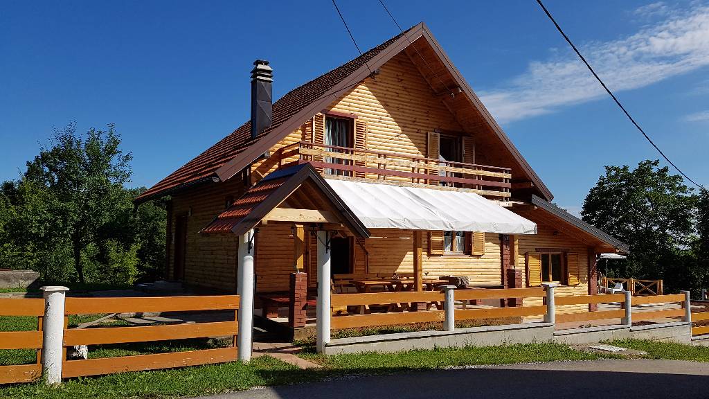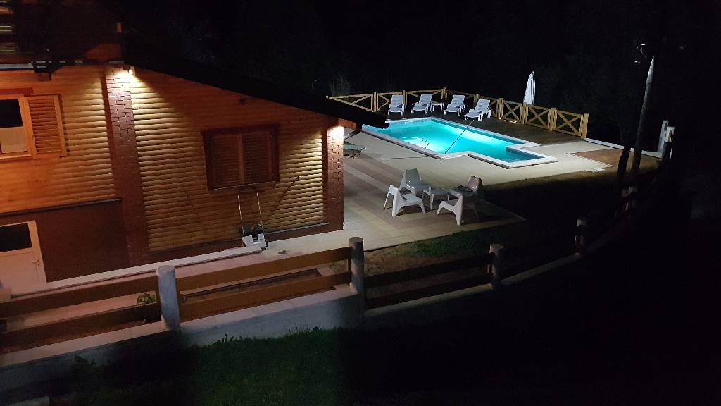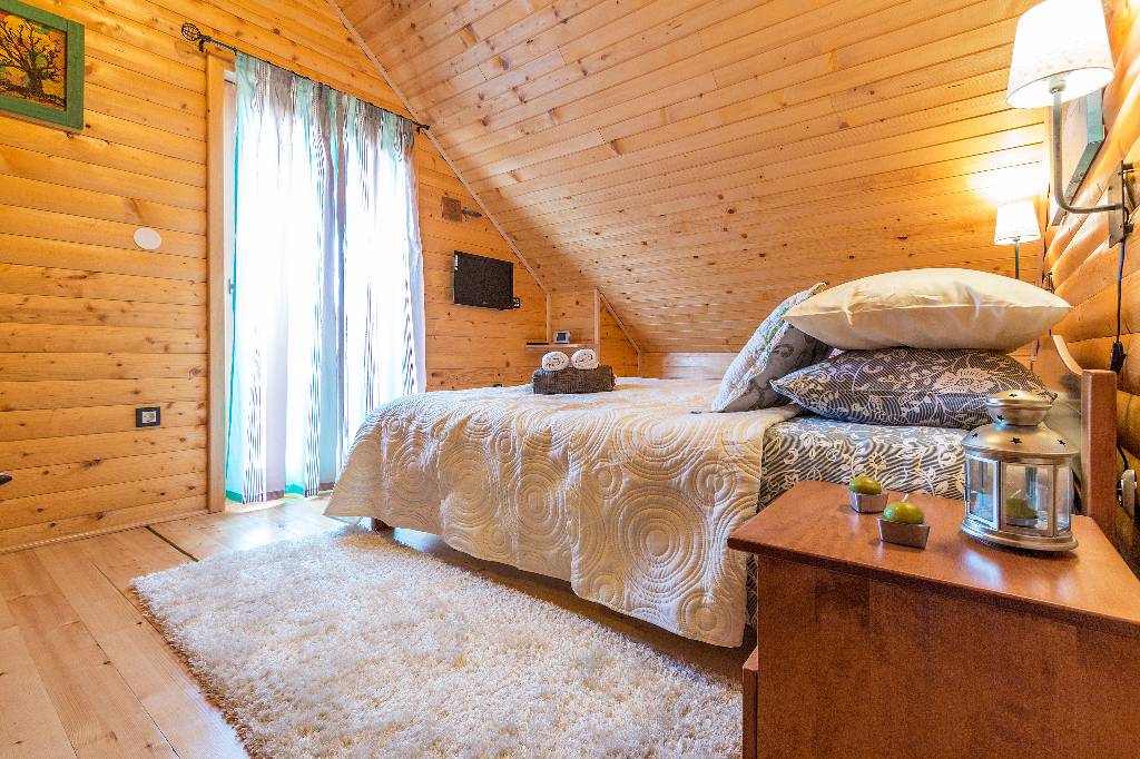 About house The wooden house in a small village on a hill surrounded by fragrant nature, is built and equipped with a lot of effort and love. It is completely wooden, equipped with modern style wooden furniture with emphasis on comfort and intimacy. Ground floor On the ground floor there is a hall, a kitchen equipped with all necessary kitchen equipment, a dining room and a spacious living room with a fireplace for cozy evenings with a nice crackling sound of fire. On a nice sunny day you can from the living room go out onto a large sunny terrace in front of the house and enjoy a comfortable lounge chair. We have also built a large outdoor fireplace where you can prepare your favorite grilled dishes. 1st Floor On the first floor there is a bathroom with a shower, a toilet and three bedrooms. Two rooms are equipped with double beds and have access to a large terrace. The third room has single beds that can be connected to a double bed. There is also a kid cot. In the living room there is a sofa that, if required can be used as 2 extra beds. In total, the capacity is 6+2 sleeping places. Each room is comfortably furnished and has a TV set. We are sure your nights will be peaceful and enjoyable... And in the mornings you may be awoken by chirping of birds and you might see snowflakes and white sparkles under the first rays of sun through the window... Wellness We are very proud of our small wellness center, which consists of a Finnish sauna for 4 to 6 persons, a whirlpool for 6 people, lounge chairs to relax, a shower area and toilet facilities. You can bath and enjoy the sauna with relaxing music and wonderfully intimate lighting of a starry sky. From our wellness oasis you can go out on the beautiful terrace to enjoy the blessings of peace and unspoiled nature. Outdoor pool In the summer months the benefits of the continental climate can be further enjoyed in the outdoor pool (dimensions 9mx4,5m) with a beautiful sunny terrace where, after a bath in you can enjoy the view of the beautiful countryside that surrounds you.+