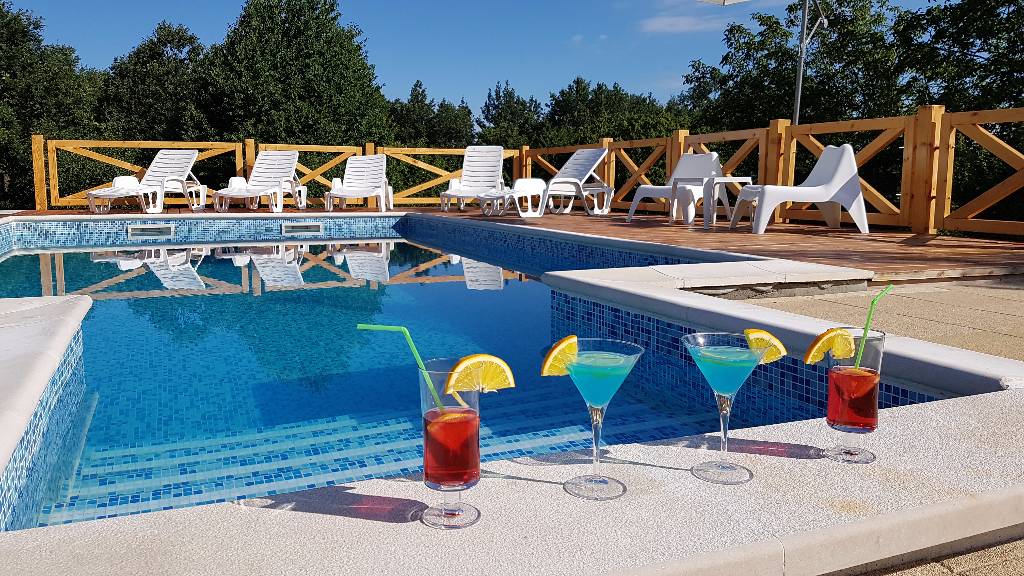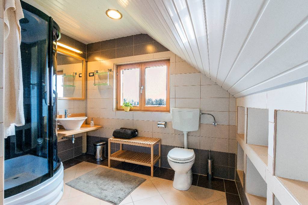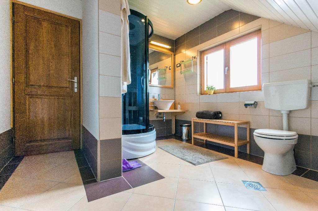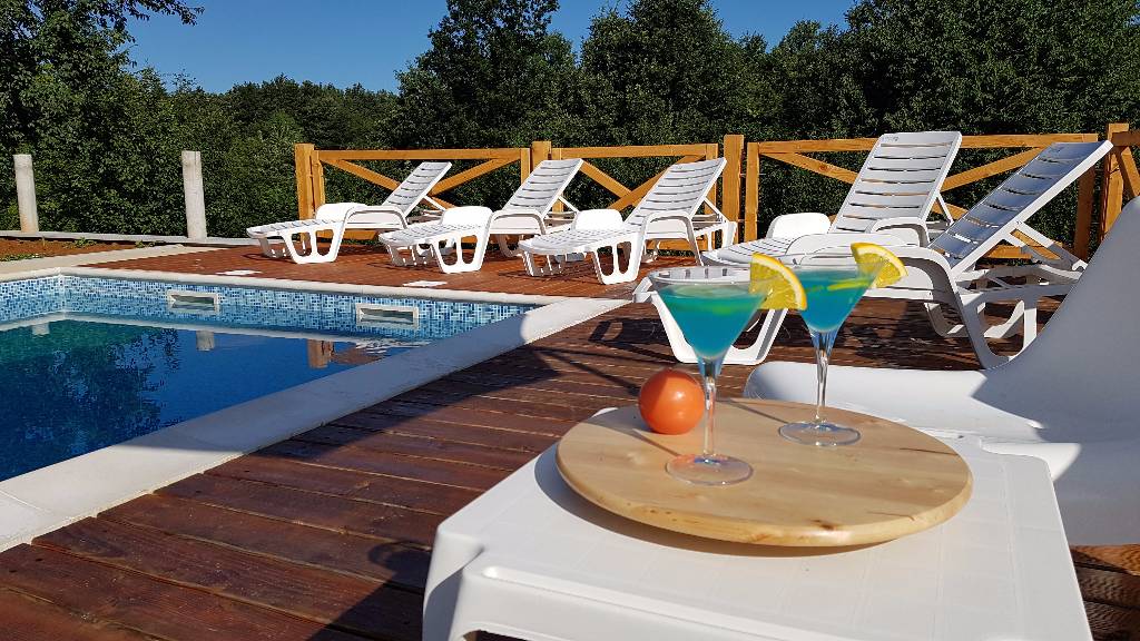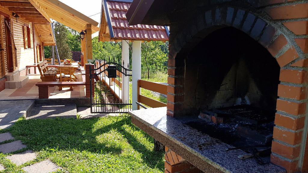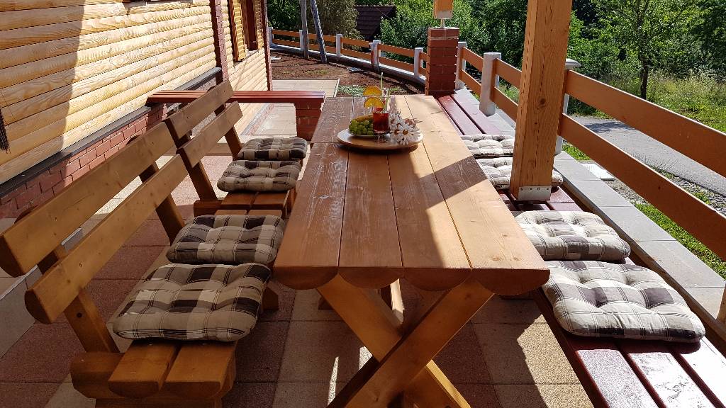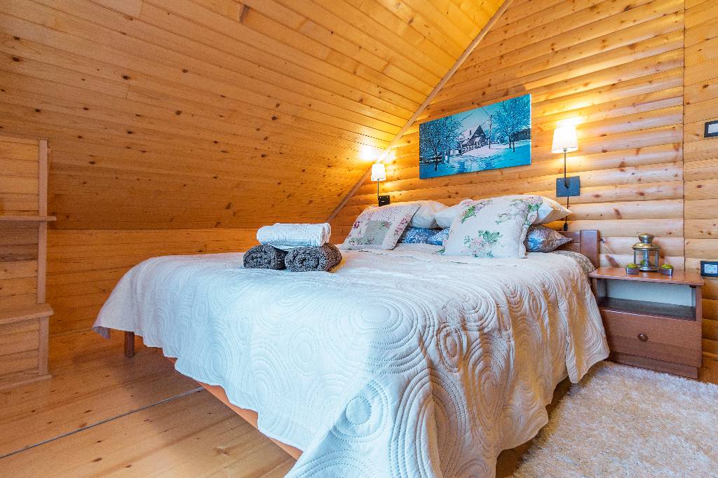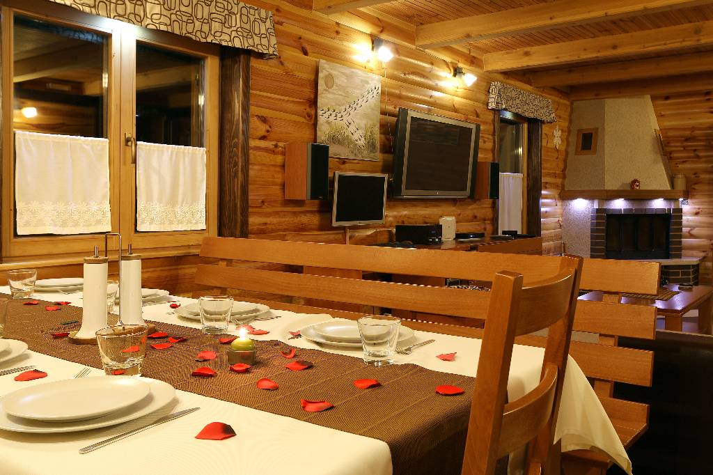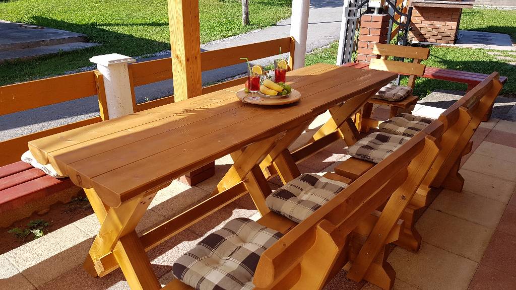 About house The wooden house in a small village on a hill surrounded by fragrant nature, is built and equipped with a lot of effort and love. It is completely wooden, equipped with modern style wooden furniture with emphasis on comfort and intimacy. Ground floor On the ground floor there is a hall, a kitchen equipped with all necessary kitchen equipment, a dining room and a spacious living room with a fireplace for cozy evenings with a nice crackling sound of fire. On a nice sunny day you can from the living room go out onto a large sunny terrace in front of the house and enjoy a comfortable lounge chair. We have also built a large outdoor fireplace where you can prepare your favorite grilled dishes. 1st Floor On the first floor there is a bathroom with a shower, a toilet and three bedrooms. Two rooms are equipped with double beds and have access to a large terrace. The third room has single beds that can be connected to a double bed. There is also a kid cot. In the living room there is a sofa that, if required can be used as 2 extra beds. In total, the capacity is 6+2 sleeping places. Each room is comfortably furnished and has a TV set. We are sure your nights will be peaceful and enjoyable... And in the mornings you may be awoken by chirping of birds and you might see snowflakes and white sparkles under the first rays of sun through the window... Wellness We are very proud of our small wellness center, which consists of a Finnish sauna for 4 to 6 persons, a whirlpool for 6 people, lounge chairs to relax, a shower area and toilet facilities. You can bath and enjoy the sauna with relaxing music and wonderfully intimate lighting of a starry sky. From our wellness oasis you can go out on the beautiful terrace to enjoy the blessings of peace and unspoiled nature. Outdoor pool In the summer months the benefits of the continental climate can be further enjoyed in the outdoor pool (dimensions 9mx4,5m) with a beautiful sunny terrace where, after a bath in you can enjoy the view of the beautiful countryside that surrounds you.+