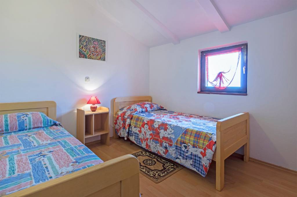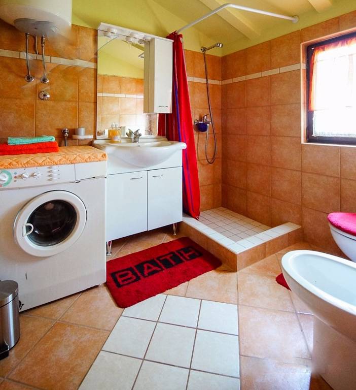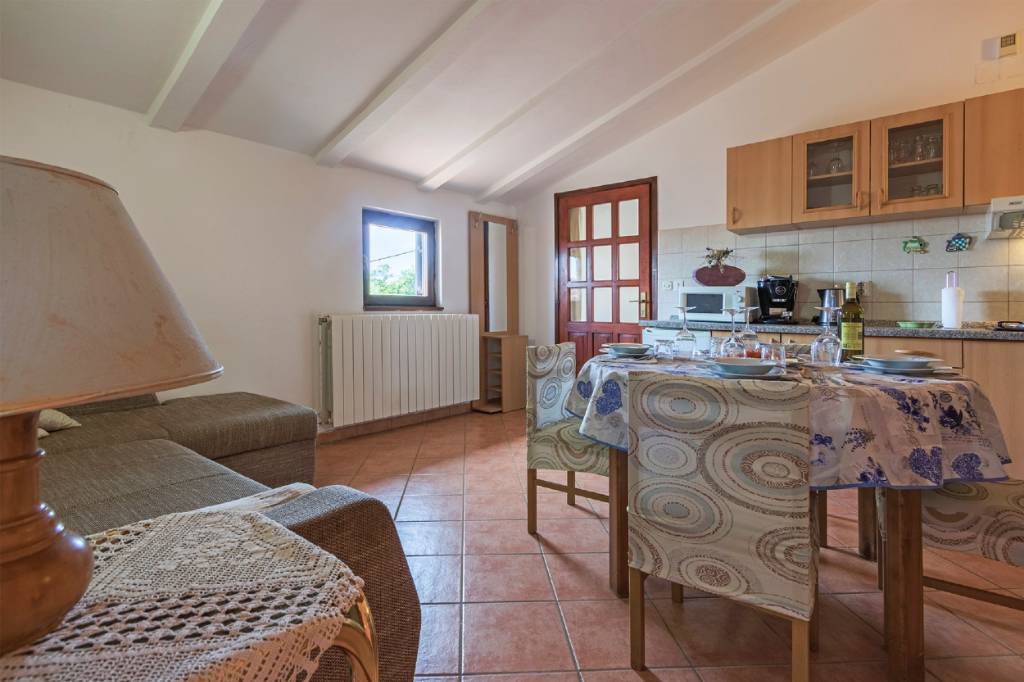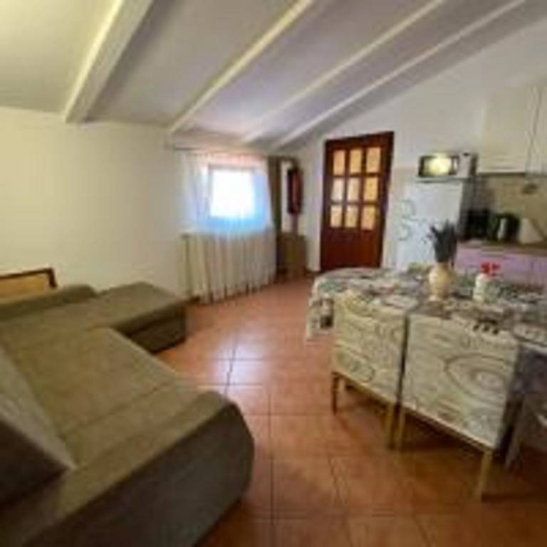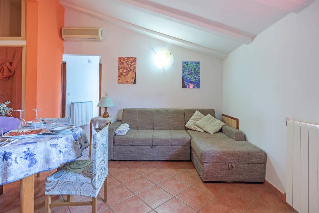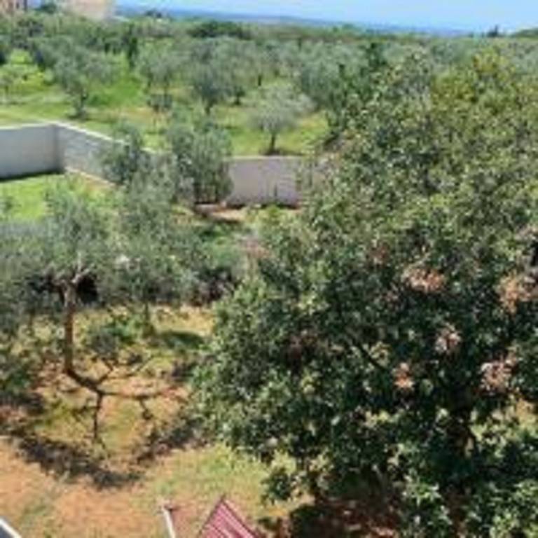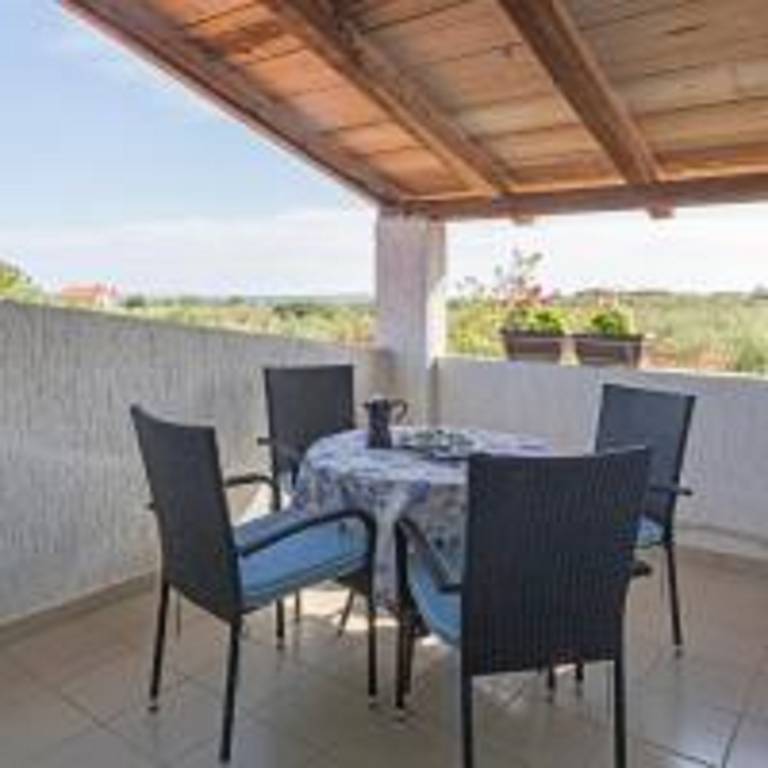 Apartment with a view of the Brijuni islands This holiday apartment is located on the outskirts of Vodnjan, surrounded by olive trees. It is on the first floor and affords a beautiful view of the sea and the Brijuni islands. The accommodation provides a beautiful, open kitchen in the spacious living room. The kitchen unit is equipped with a microwave, kettle, coffee machine, toaster, fridge with freezer compartment, and all the essentials for a pleasant stay. The apartment has air conditioning, a TV with satellite reception and a DVD player, and free wireless Internet access throughout. It is suitable for four people and has two bedrooms. The bedrooms each have two single beds measuring 90 x 200cm. You can pull out the sofa in the living room into another bed. One bedroom has its own bathroom with a shower, and the second, larger bathroom also has a washing machine. There are air conditioning units in the kitchen and in the living room, but the cool air also reaches the bedrooms. The terrace is roofed and furnished, so you can enjoy meals outdoors. In the morning you can enjoy your coffee accompanied by the chirping of crickets and the twittering of birds. The house is surrounded by over 1000m² of greenery and olive groves. There is a private parking space on site. The extensive plot of land is fenced. Next to the house, about 100 metres away, there is the restaurant run by the owner’s parents, where you can try the best ham, olive oil and wine in Istria. Breakfast, lunch and dinner, as well as traditional Istrian dishes, can be arranged on request. The nearest beaches are Peroj and Fažana, both less than three minutes (4km) away by car. Pula airport is a fifteen-minute drive away. The nearest shop is 500-700 metres away, as are a petrol station and a café. Active holiday-makers can hire bicycles nearby. The location of the house is convenient for exploring the whole of Istria, with Pula 10km away and Rovinj 20km.