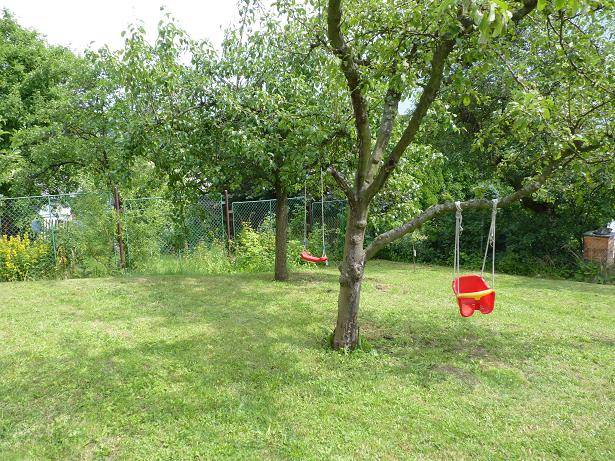 Zur Verfügung steht geplegter Garten mit Sitzmöglichkeit, Feuerstelle, Trampoline, Sandkasten usw.