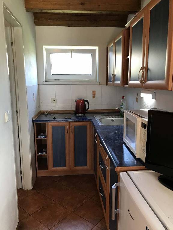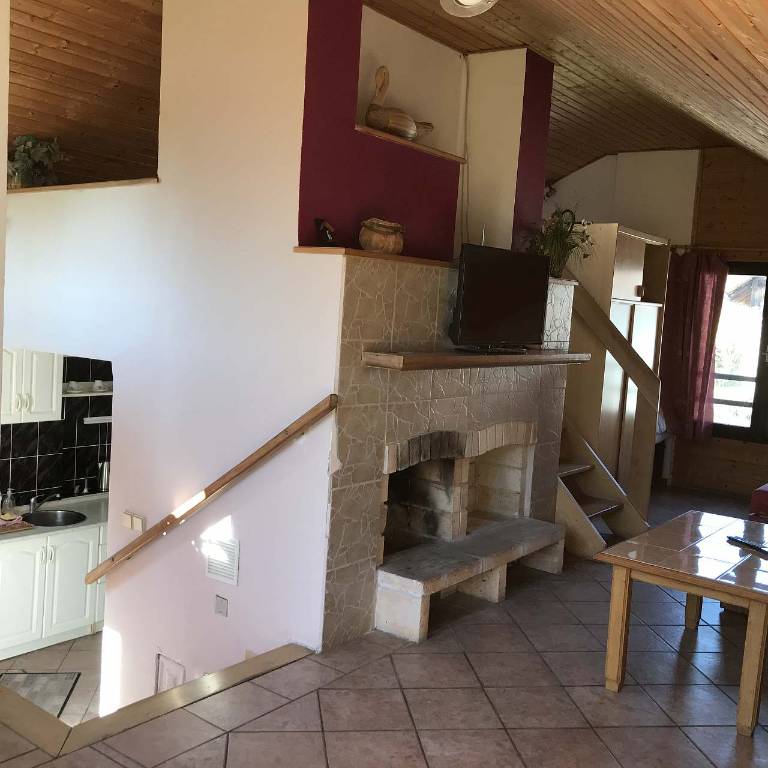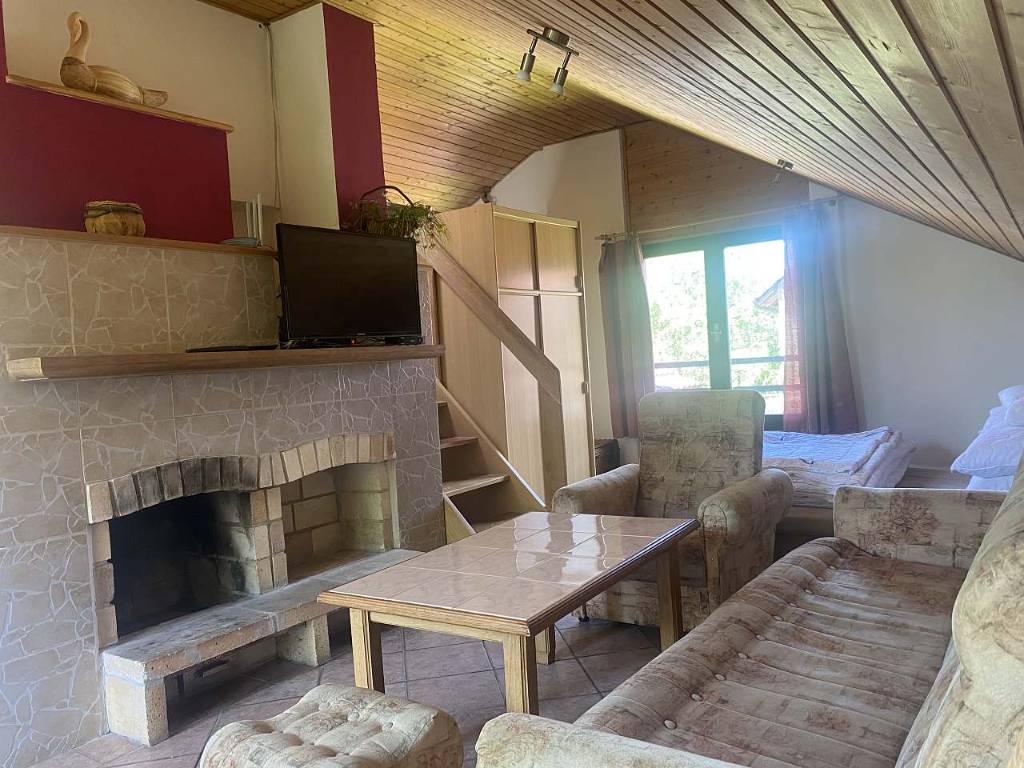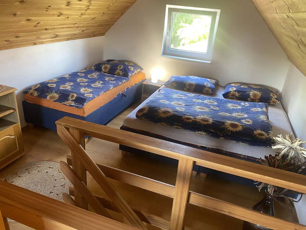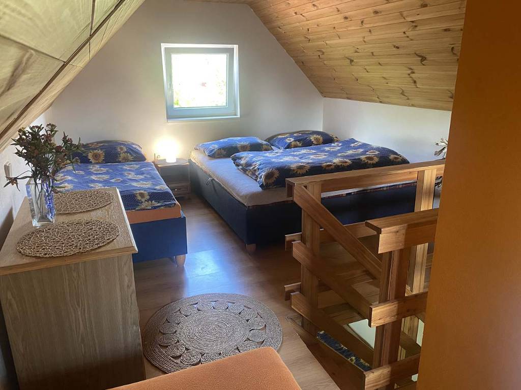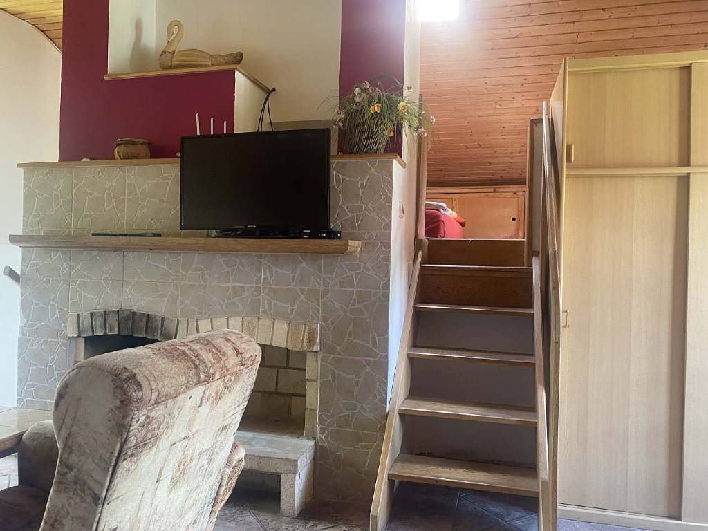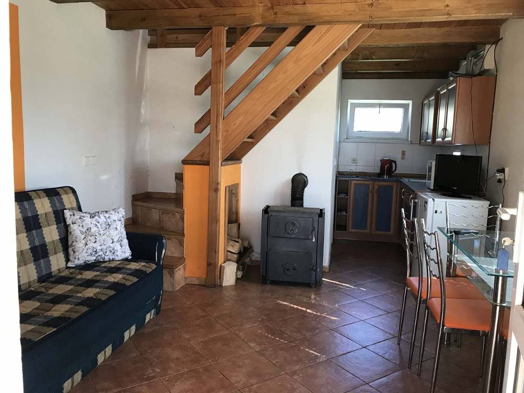 Im Erdgeschoss befindet sich eine ausgestattete Küche mit Speisekammer (Herd, Backofen, Wasserkocher, Mikrowelle, Kühlschrank) und einem Esstisch mit direktem Zugang auf die Terrasse. Im Erdgeschoss gibt es auch ein Badezimmer und eine Toilette. Nur 3 Stufen nach oben gibt es ein Wohnzimmer mit Fernseher, Kamin (funktioniert nicht - im Moment nur Dekoration und er wurde durch einen klassischen Kamin ersetzt) und ein Schlafsofa. Des Weiteren gibt es hier auch 2 Einzelbetten und 2 Schlafsofas (Platz im Wohnzimmer für insgesamt 5 Personen). Nach weiteren drei Stufen kommt man ins Dachgeschoss - "Schlafen für Kinder" in Form von Matratzen auf dem Boden (5 - 6 Plätze - ideal für ältere Kinder). Insgesamt verfügt das Haus über 2 Betten + 3 - 4 Plätze auf der Couch + 5 - 6 Matratzen.