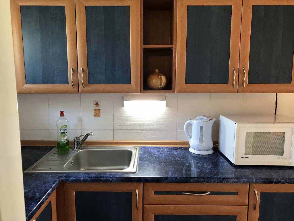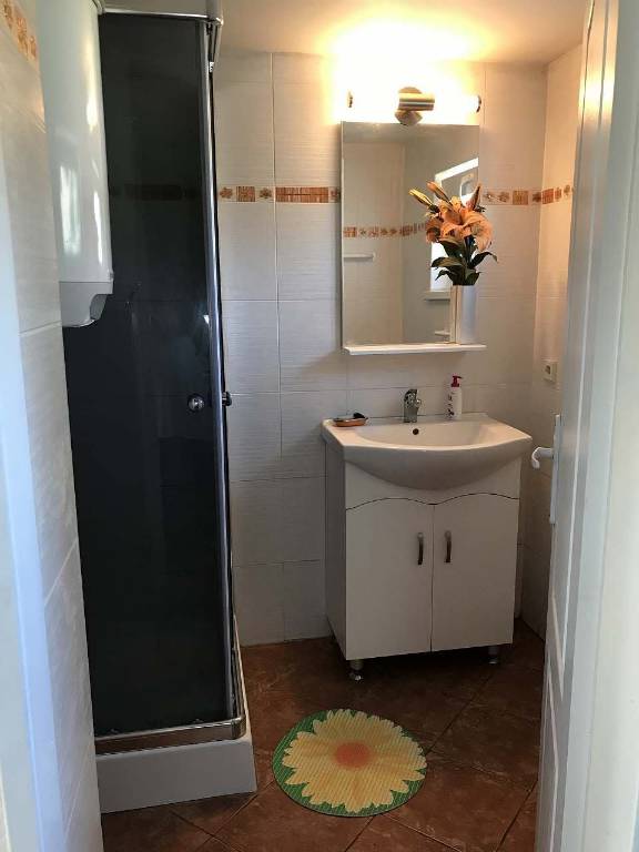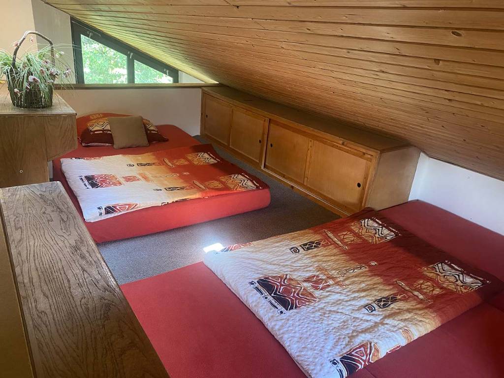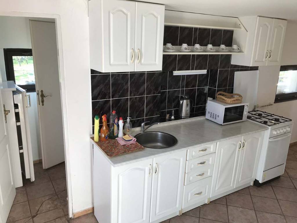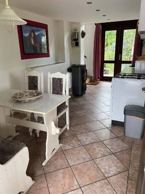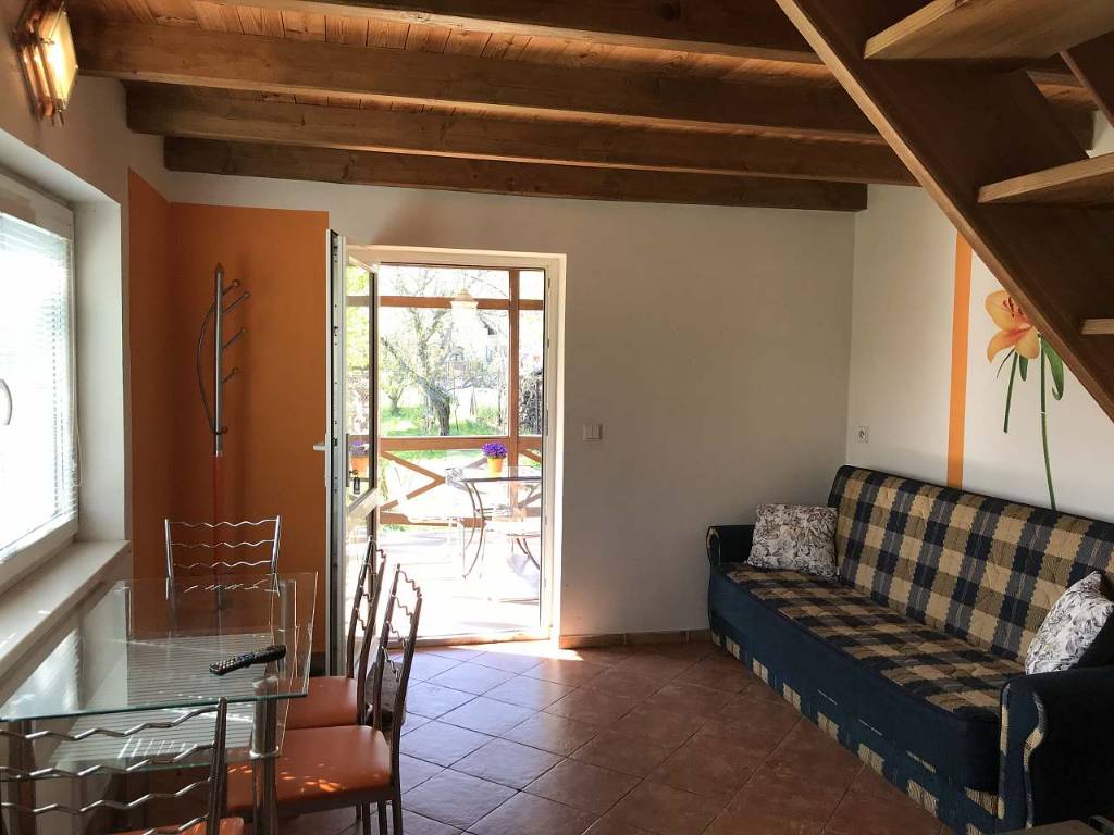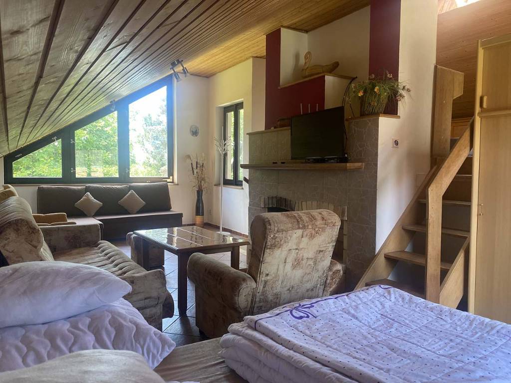 Im Erdgeschoss befindet sich eine ausgestattete Küche mit Speisekammer (Herd, Backofen, Wasserkocher, Mikrowelle, Kühlschrank) und einem Esstisch mit direktem Zugang auf die Terrasse. Im Erdgeschoss gibt es auch ein Badezimmer und eine Toilette. Nur 3 Stufen nach oben gibt es ein Wohnzimmer mit Fernseher, Kamin (funktioniert nicht - im Moment nur Dekoration und er wurde durch einen klassischen Kamin ersetzt) und ein Schlafsofa. Des Weiteren gibt es hier auch 2 Einzelbetten und 2 Schlafsofas (Platz im Wohnzimmer für insgesamt 5 Personen). Nach weiteren drei Stufen kommt man ins Dachgeschoss - "Schlafen für Kinder" in Form von Matratzen auf dem Boden (5 - 6 Plätze - ideal für ältere Kinder). Insgesamt verfügt das Haus über 2 Betten + 3 - 4 Plätze auf der Couch + 5 - 6 Matratzen.