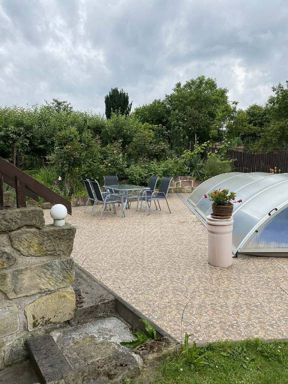 Wir bieten komfortable Unterkunft in einem großen, eingezäunten, gepflegten Garten mit Aussenpool mit Salzwasser), 5 Gehminuten von der mittelalterlichen Taverne und dem Schloss Dětěnice entfernt.