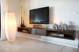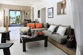 Die Dekoration harmoniert mit der Umgebung; natürliche Materialen, Steine, Holz, Zement und Inox. Der Styl ist modern und Chic, grobe Stoffe, Leinen, gemütliche Möbel.