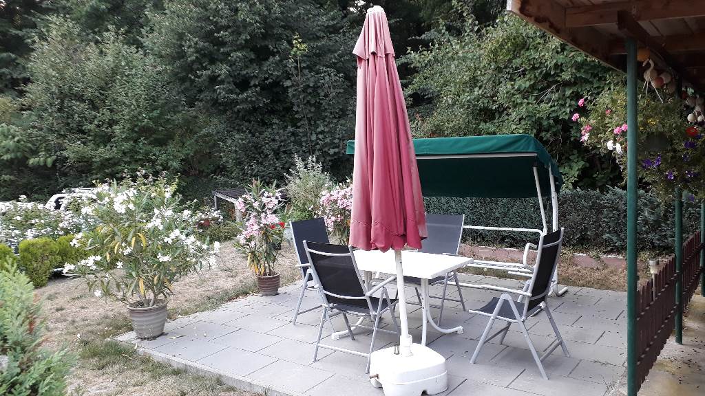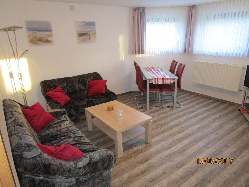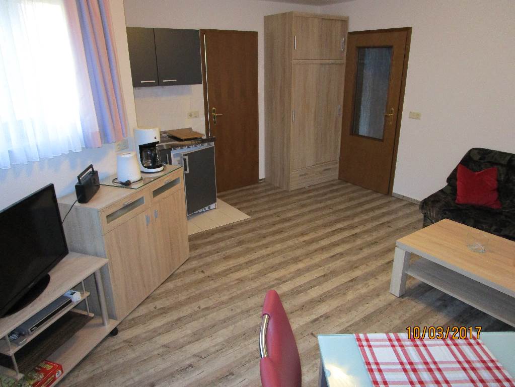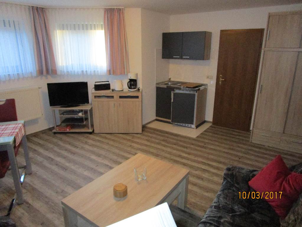Die Ferienwohnung hat eine Größe von 45m² und besteht aus einem Wohnzimmer mit integrierter Singleküche, einem Schlafzimmer mit Doppelbett, einem Schlafzimmer mit zwei Einzelbetten sowie einem Bad mit Dusche. Sie verfügt über einen separaten Eingang und PKW-Stellplatz. Die Küche ist komplett
