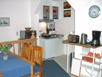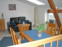 Die Wohnfläche der Dachgeschosswohnung beträgt ca. 35 qm, für 2 Personen. Gemeinsamer Wohn-und Schlafbereich mit Doppelbett und gemütlicher Sofa-Ecke. Esstisch mit 4 Stühlen, Miniküche, Sat-TV, DVD-Player, Radio, Badezimmer mit Dusche und WC. Gaszentralheizung, Isolierfenster, Bodenbelag Flies