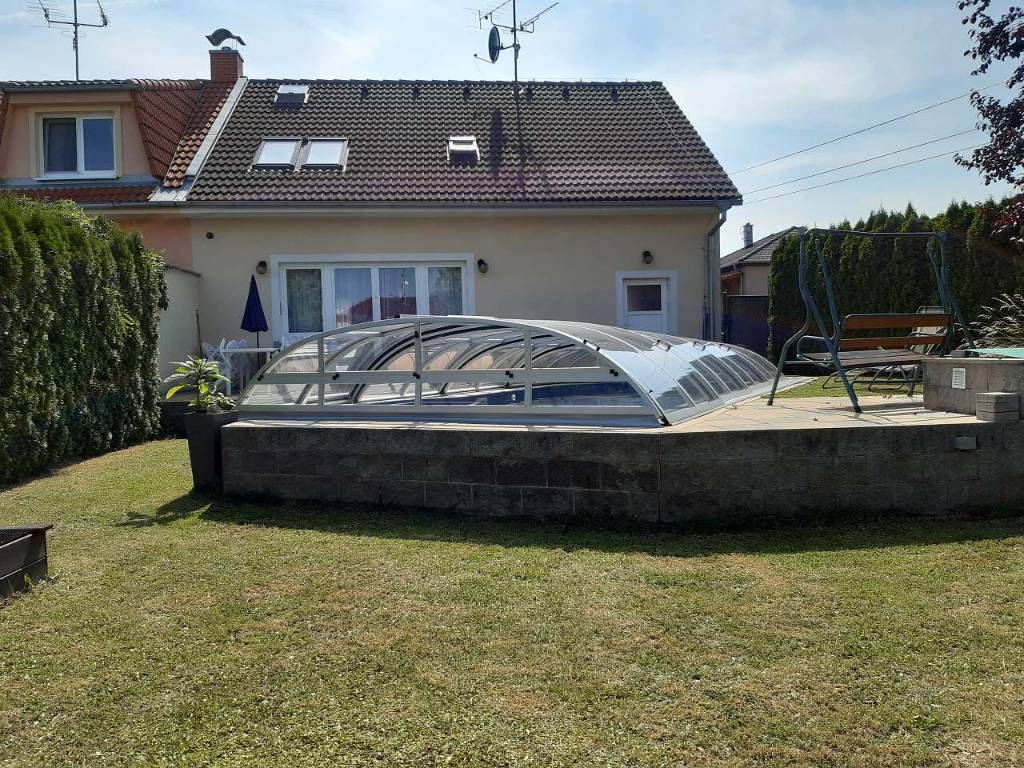 Der Garten ist eingezäunt, hir findet man eine gemütliche Terrasse + Sitzgelegenheiten im Freien, Grill + Aussenpool.