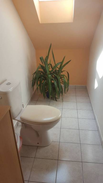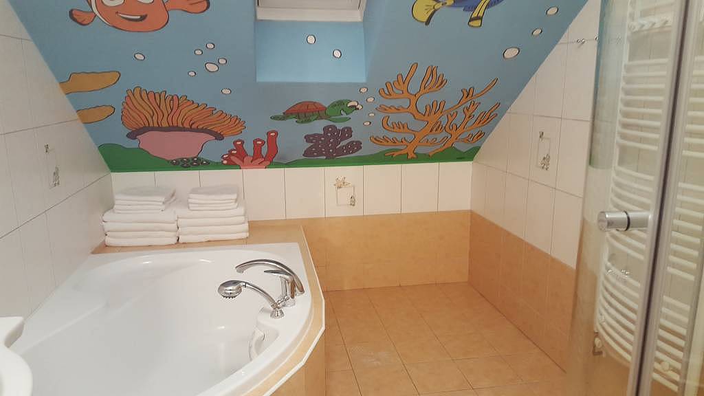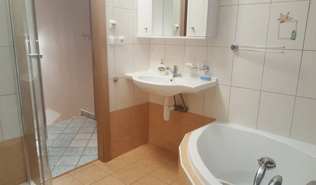 Badezimmer mit Badewanne und Dusche sowie eine separate Toilette + Waschmaschine
