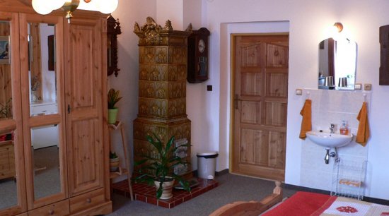 Ein gemütliches Zimmer für zwei mit heimischer Atmosphäre, malerischen ausblick und einen hübschen Kachelofen. Das Zimmer ist weiter mit Fernseher und Kühlschrank ausgestattet. Dusche und WC befindet sich auf dem Hausflur.