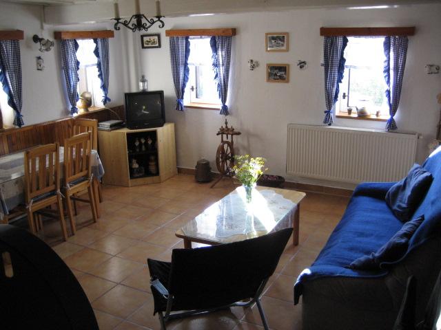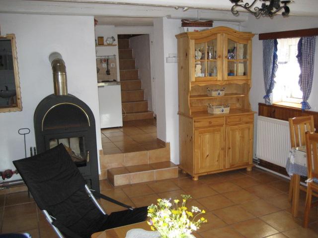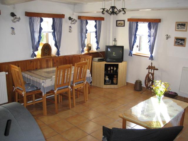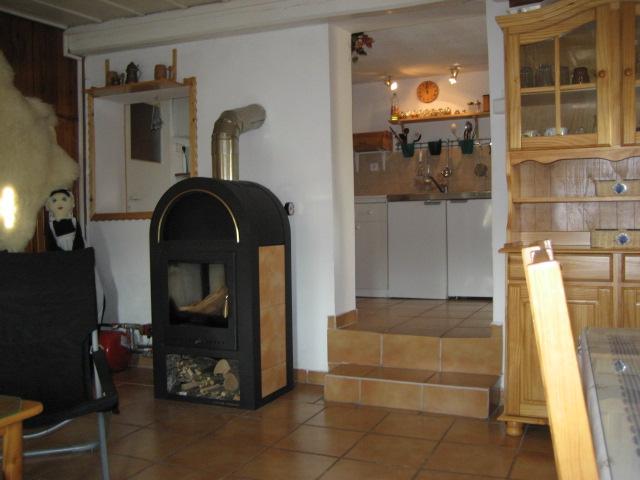 Schön eingerichtetes 4-Zimmer-Ferienhaus (80 qm) für 8 Personen über dem Ort am Wald. Windfang. Wohnraum (28 qm) mit optisch getrennter Kochnische ist mit Couch, Kaminofen, Essecke, TV und Radio ausgestattet.