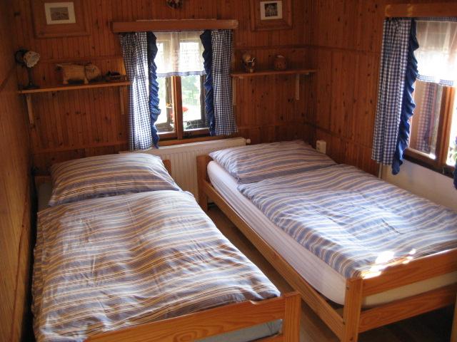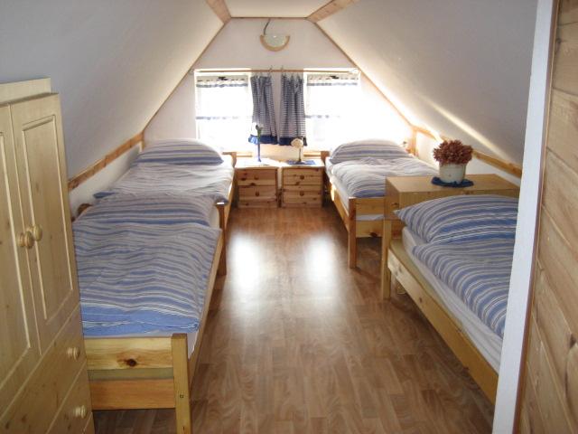 Steile Treppe ins Dachgeschoss, wo sich 3 Schlafzimmer befinden: 1/ und 2/ (7 qm) mit je 2 Einzelbetten, 3/ (18 m2) mit 4 Einzelbetten (Dachschräge). El. Heizung + Kaminofen (Holz).