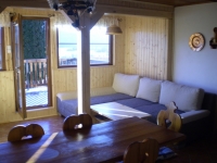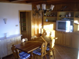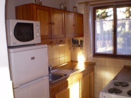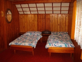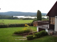 Ein 200 m vom Strand gelegenes 3-Zimmer-Ferienhaus, resp. Doppelhaushälfte (ca. 80 m2) für 6 Personen. Schmales Vorzimmer. Ein gemütlicher Wohn-Ess-Raum (19 m2) mit Sitzmöbel, Essecke, Ofen und TV+SAT; Zugang zur Terrasse mit Sitzmöglichkeit und mit einer schönen Aussicht auf den Stausee Lipno