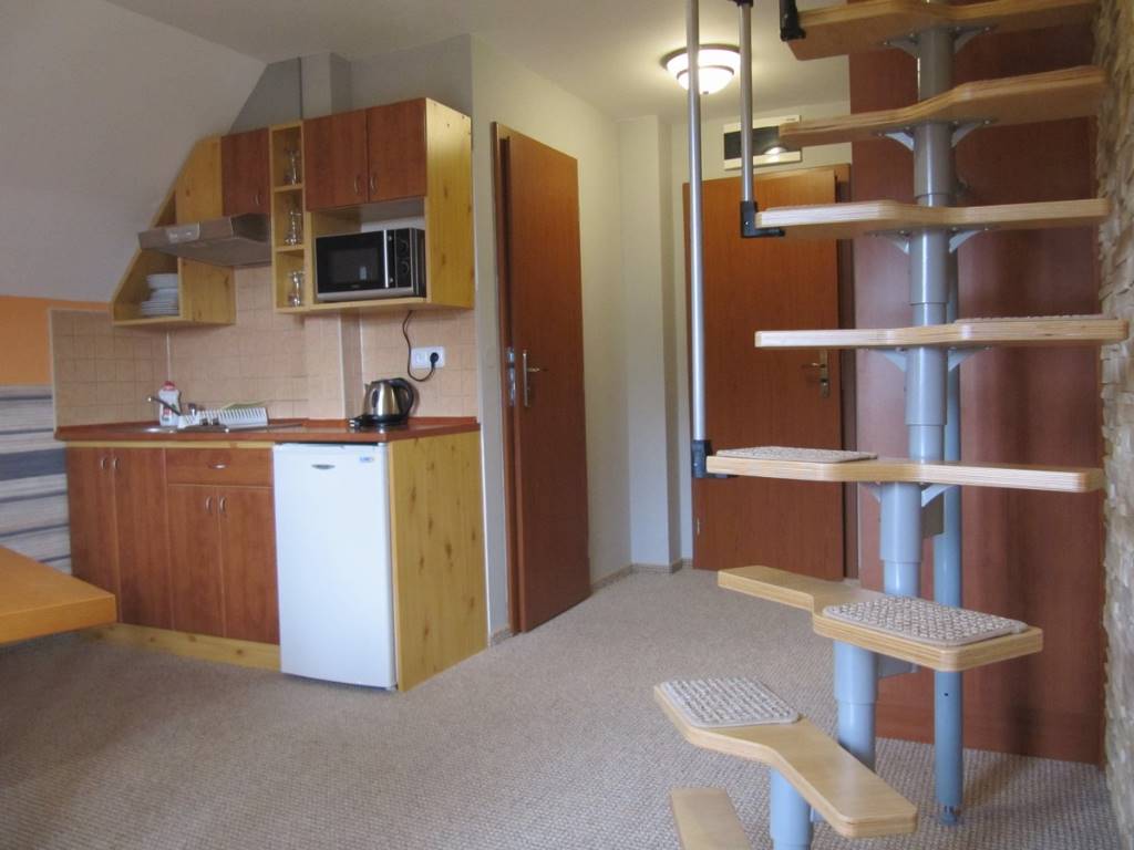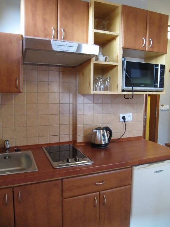 Weiter finden Sie in jedem Appartement komplett eingerichtete Küche mit einer Mikrowelle, Kühlschrank und Kochplatte, Grundgeschirr und Essecke