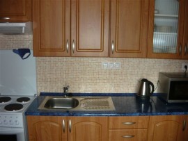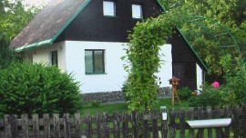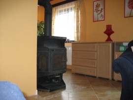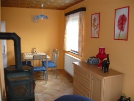 eingerichtetes 4-Zimmer-Ferienhaus (80 qm) für 8 Personen am Rande des kleines Ortes am Wald. Flur. Wohnraum (17 qm) mit optisch getrennte Kochnische ist mit Sitzgarnitur, Essecke, Kaminofen, TV, DVD und Radio ausgestattet. In der Kochnische stehen Elektroherd (4 Kochplatten, Backofen), Kühlschran