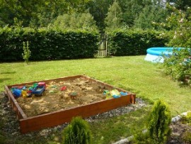 k, Gefrierschrank, Mikrowelle und Wasserkocher zur Verfügung. Schlafzimmer (9 qm) mit einem Ehebett. Wannenbad mit WC. Im Obergeschoss befinden sich 2 Schlafzimmer: 1/ (12 qm) mit 3 Einzelbetten und 2/ (17 qm) mit 3 Einzelbetten. El. Heizung. Nichtraucherhaus. Im eingezäunten Garten (800 qm) stehen Gartenpool (Ø 3,6 m, tief 0,7 m), Gartenmöbel, Aussenkamin und Sandkasten für Kinder zur Verfügung. Uneingezäunte PKW-Abstellplätze