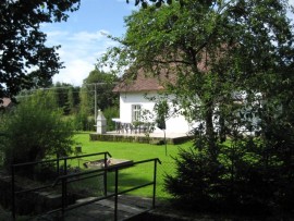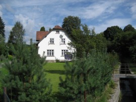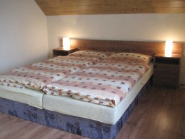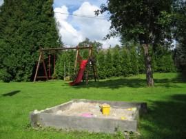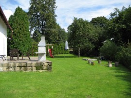 platten, Backofen), Kühlschrank mit Tiefkühlbox, Mikrowelle, Kaffeemaschine und Wasserkocher zur Verfügung. Bad mit Badewanne und Duschnische – Boiler 120 l. Separates WC. Im Dachgeschoss befinden sich 3 Schlafzimmer: 1/ (9 qm) mit einem Doppelbett, 2/ (11 qm) mit einem Doppelbett, 3/ (15 qm) mit einem Doppelbett und 2 Einzelbetten. Separates WC. El. Heizung oder Kohle/Holzheizung. Im Garten stehen Aussensitzmöglichkeit, Aussenkamin mit Grill, Feuerstelle und Spielplatz für Kinder. Durch den Garten fliesst ein kleiner Bach. Eingezäunte PKW-Abstellplätze. Bei den Aufenthalten, die kürzer als 7 Nächte sind, steht Bettwäsche nicht zur Verfügung.