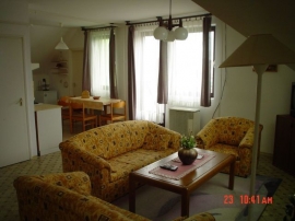 Obengeschoss: 2 Doppelzimmer, amerikanisches Wohnzimmer mit Sitzgarnitur und SAT-TV, mit Küche und mit Essecke, Badezimmer mit Wanne, separat WC.