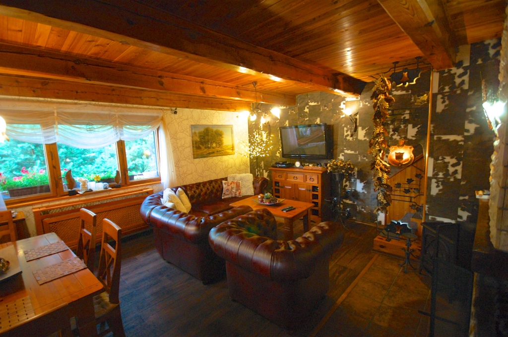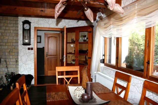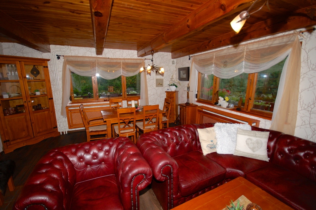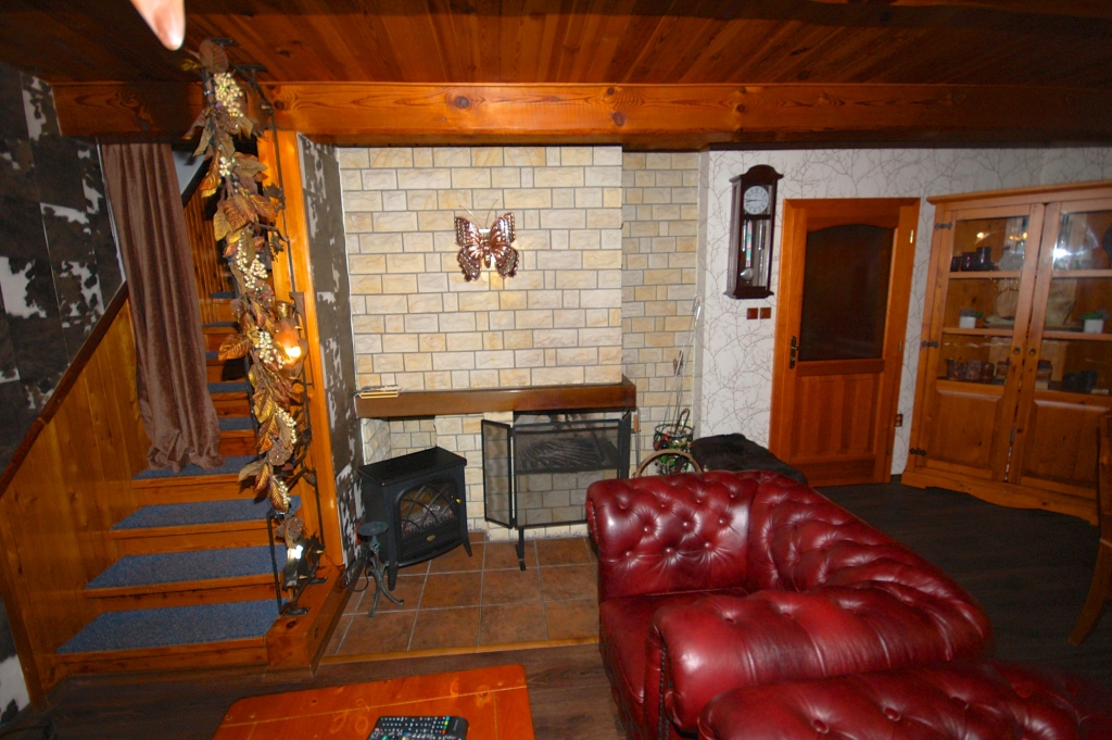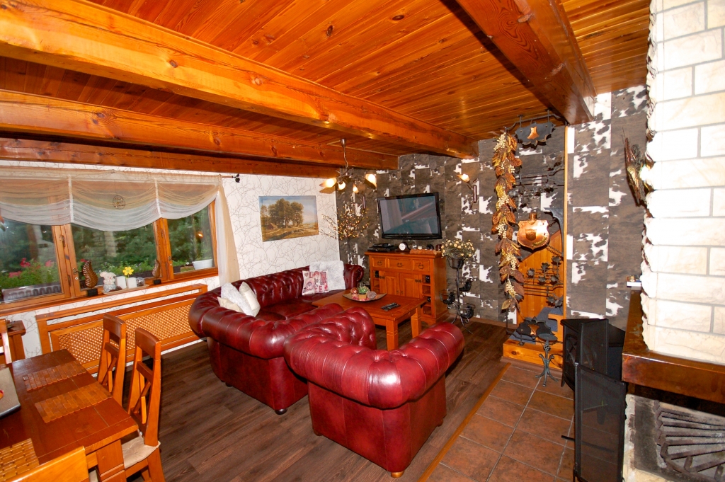 Herrliches modern ausgestattetes Ferienhaus mit schönem Freisitz, von Nadelwäldern umgeben. Das Haus ist für maximal 5 Erwachsene + 2 Kleinkinder bis 5 Jahre (im Reisebettchen oder im Elternbett oder zur Verfügung stehen 2 Matratzen) Erdgeschoss: Wohnzimmer mit Kamin und TV/SAT Küche (Kühls