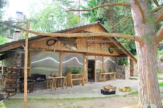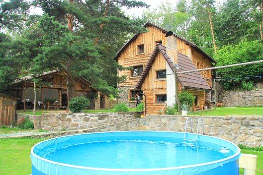 Großes, besonders attraktives canadien Ferienhaus mit Pool und Billiard fast alleinstehend in den Wäldern am Dorf Klasterecka Jesen, 5 km von der Aquapark in Klášterec nad Ohří im Erzgebirge in Tschechien.