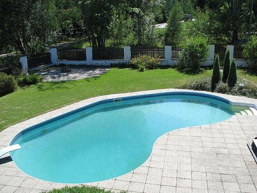 Aussen: Pool - 10x4x2,5 m. Umzäuntes Grundstück, offener Kamin im Garten, überdachte Terrasse mit Sitzung, Gartenmöbel. Parkplatz am Haus, Haustiere ja.