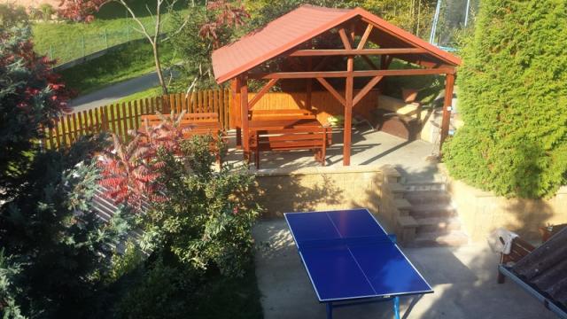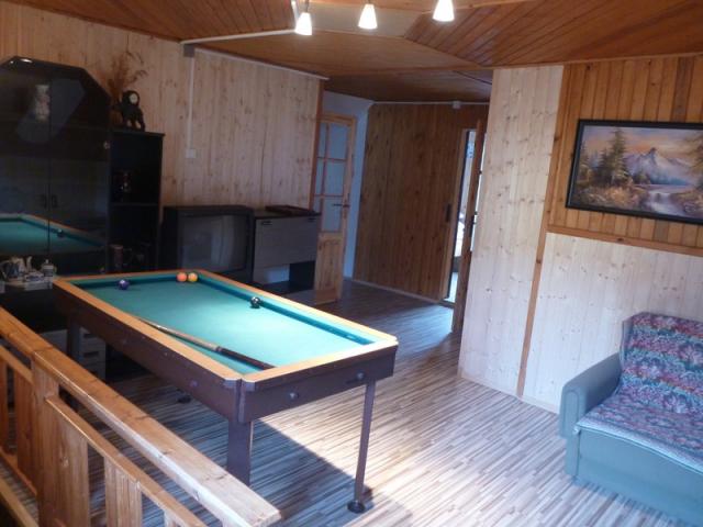 Im Inneren der Hütte ist ausgestattete Küche (Herd mit Ceran-Kochfeld und Elektro. Backofen, Kühlschrank, Geschirrspüler, Mikrowelle, elektrischer Wasserkocher), ein großes Wohnzimmer mit Essbereich, Kamin, Sat-TV und einen Aufenthaltsraum mit einem Billardtisch. Insgesamt gibt es 6 Schlafzimmer (5 Betten, 4 Betten, 4 Betten, 3 Betten, 2 Betten und 2 Betten). Sanitäre Anlagen gehören 2 Badezimmer mit Dusche und WC. Geheizt wird mit einer kombinierten Kamin und E zur Verfügung gestellt. Heizungen. Raum für Fahrräder und Skier. Die Hütte Außenpool 3,6 x 1,1 m mit Solarheizung (Sonnensegel), einem großen teilweise eingezäunten Grundstück, Lagerfeuerplatz mit Sitzmöglichkeit, Trampolin Durchmesser von 4 m, Grill, Räucherkammer, Tischtennis im Freien, Gartenmöbel, Terrasse, Sandkasten, Kegeln und eine große überdachte Pergola. Parkplätze am Haus. Der Vermieter nicht in dem Gebäude leben.