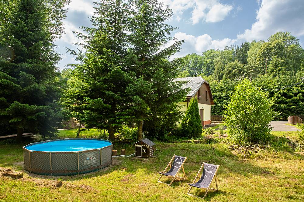 Geräumiges Ferienhaus für 20 Personen in 6 Schlafzimmern mit Holzeinrichtung und Schwimmbad in der Nähe des Waldes, 1 km vom Dorf Studenec, 7 km von Jilemnice und 10 km von Nová Paka entfernt, an der Grenze zwischen dem Böhmischen Paradies und dem Riesengebirge. Das gesamte Ferienhaus liegt au