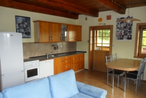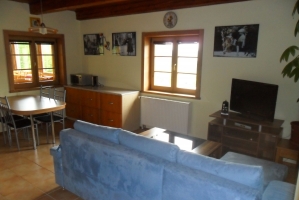 - geräumiger Wohnraum 25m2 mit einem Schlafsofa, Esstisch mit 6 Sitzplätzen, 4 Sessel, eine grosse Sitzgarnitur, Küche und Essecke. Das Zimmer ist durchgänglich, von hier aus kommt man auf eine überdachte Terrasse mit Sitzmöglichkeit.