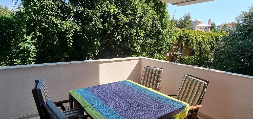 The apartment is a spacious, light and modern accommodation, located within an enclosed garden and parking area, full of greenery, fruit trees and other vegetation. The apartment is the only accommodation in a stand-alone house, which ensures quiet and secluded surroundings. All rooms in the apartment are air-conditioned. There is a spacious terrace and outdoor area, a grill area, and plenty of parking space, for up to three vehicles. The locality is practical, whilst also quiet, with the nearest beach, several restaurants, cafe bars, and a mid-size grocery shop located around 50 - 100m away.