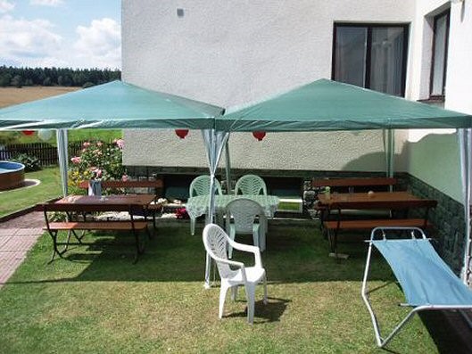 Oplocený pozemek, venkovní zapuštěný osvětlený bazén 8x4 m se slanou vodou a protiproudem, skládací altán, ohniště s posezením, venkovní gril, zahradní posezení, zahradní nábytek, slunečník, stolní tenis, soukromé hřiště na trávníku - volejbalová síť.
