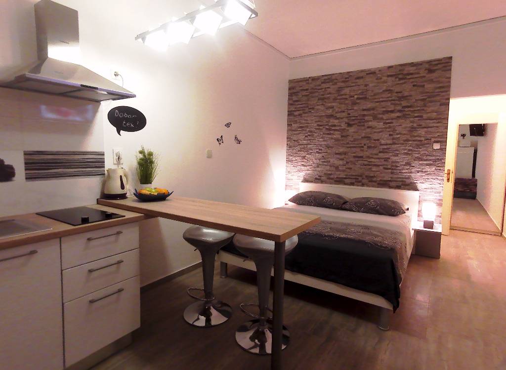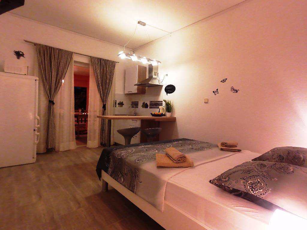 Studio für zwei Erwachsene und ein Kind und eine große Terrasse. Die Entfernung vom Strand ist 70m. Voll ausgestattete Küche mit Kühlschrank mit Gefrierfach, Mikrowelle, Wasserkocher , Klimaanlage , WI-FI ... Willkommen!