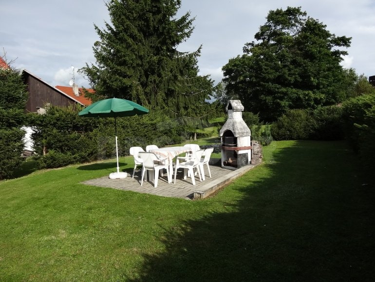 Garten ist uneingezäunt mit Sitzmöglichkeit, Grill und Parken.