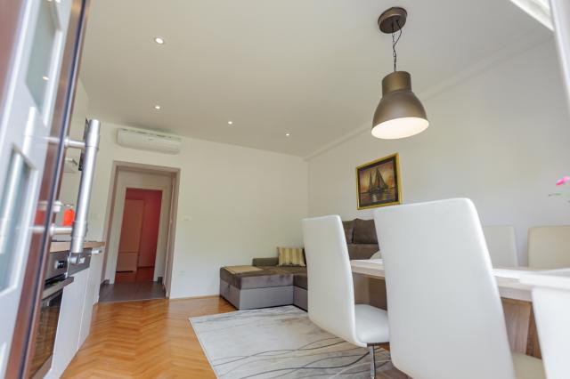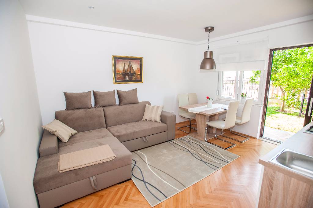 Zwei-Zimmer-Wohnungen im Erdgeschoss (mit je zwei Schlafzimmern, Küche, Wohnzimmer, Bad, separates WC) befinden sich 5-10 Minuten fahrt von Split, 2-3 min zu fuß zum Meer, suparmarketa, Ärzte, Apotheker, autobosne Werken und anderen notwendigen Einrichtungen. In der Nähe des Golfplatz, Camp für