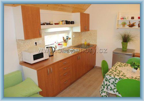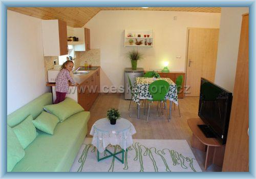 Der selbständige Eingang, das Parken am Objekt. Ein Wohnzimmer mit einem Küchenecken (eine Kochplatte, eine Kochkanne, eine Mikrowelle, ein Kühlschrank) und einem ausziehbaren Bett, ein Schlafzimmer, ein Badezimmer mit einer Dusche und zwei Waschbecken. Auf Wunsch ein Kinderbett, ein Kinderstuhl und eine Kinderwanne.